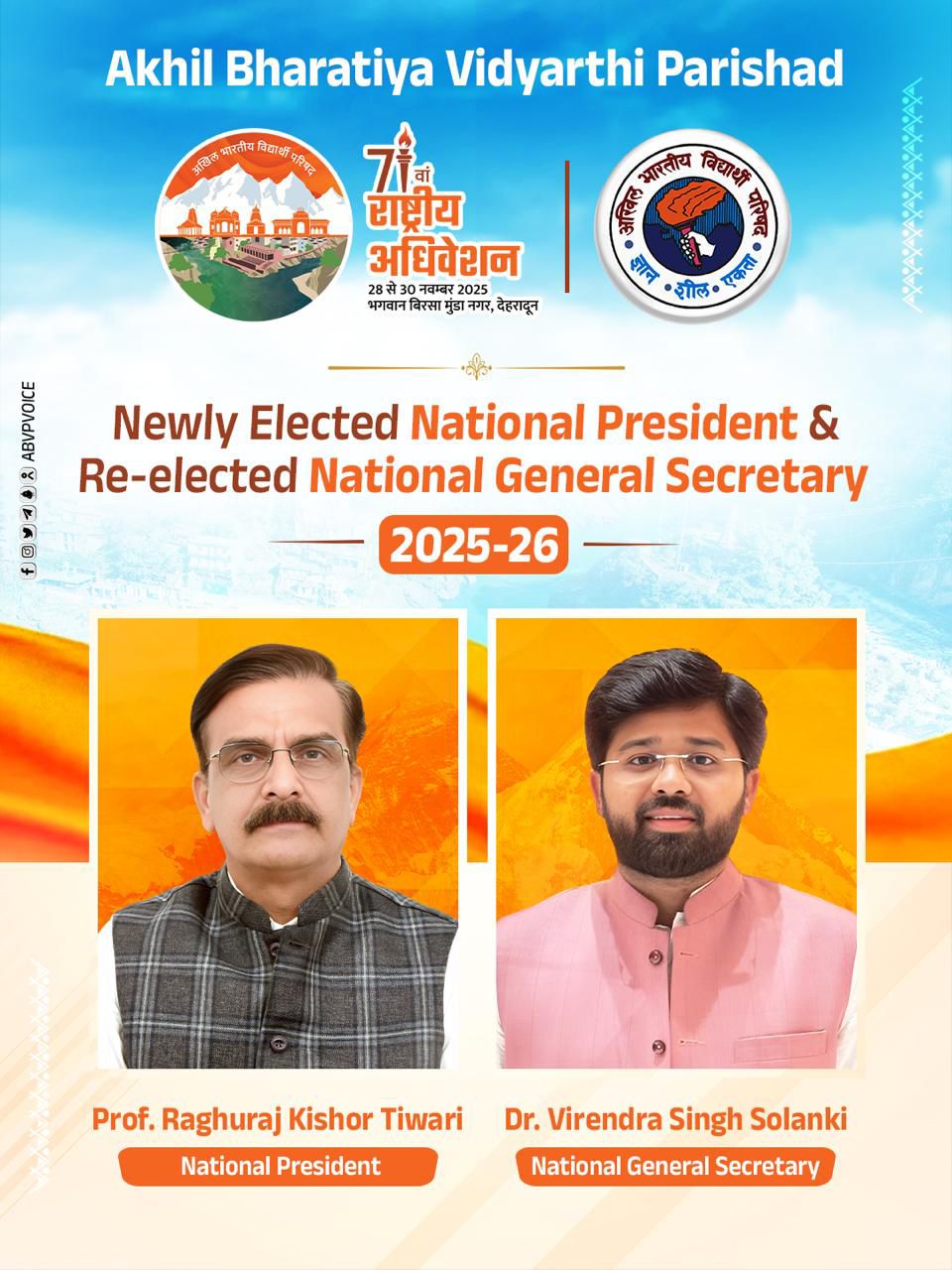 प्रो. (डॉ.) रघुराज किशोर तिवारी अभाविप के राष्ट्रीय अध्यक्ष नवनिर्वाचित तथा डॉ. वीरेन्द्र सिंह सोलंकी अभाविप के राष्ट्रीय महामंत्री के रूप में पुनर्निर्वाचित